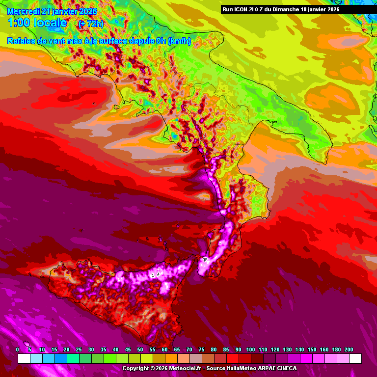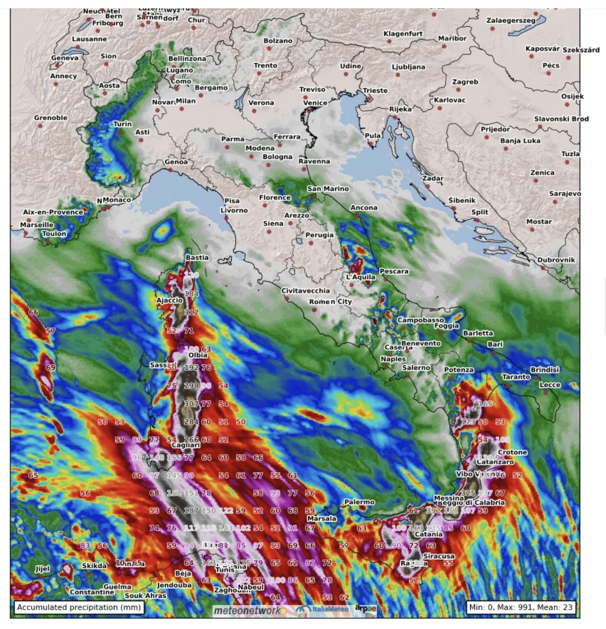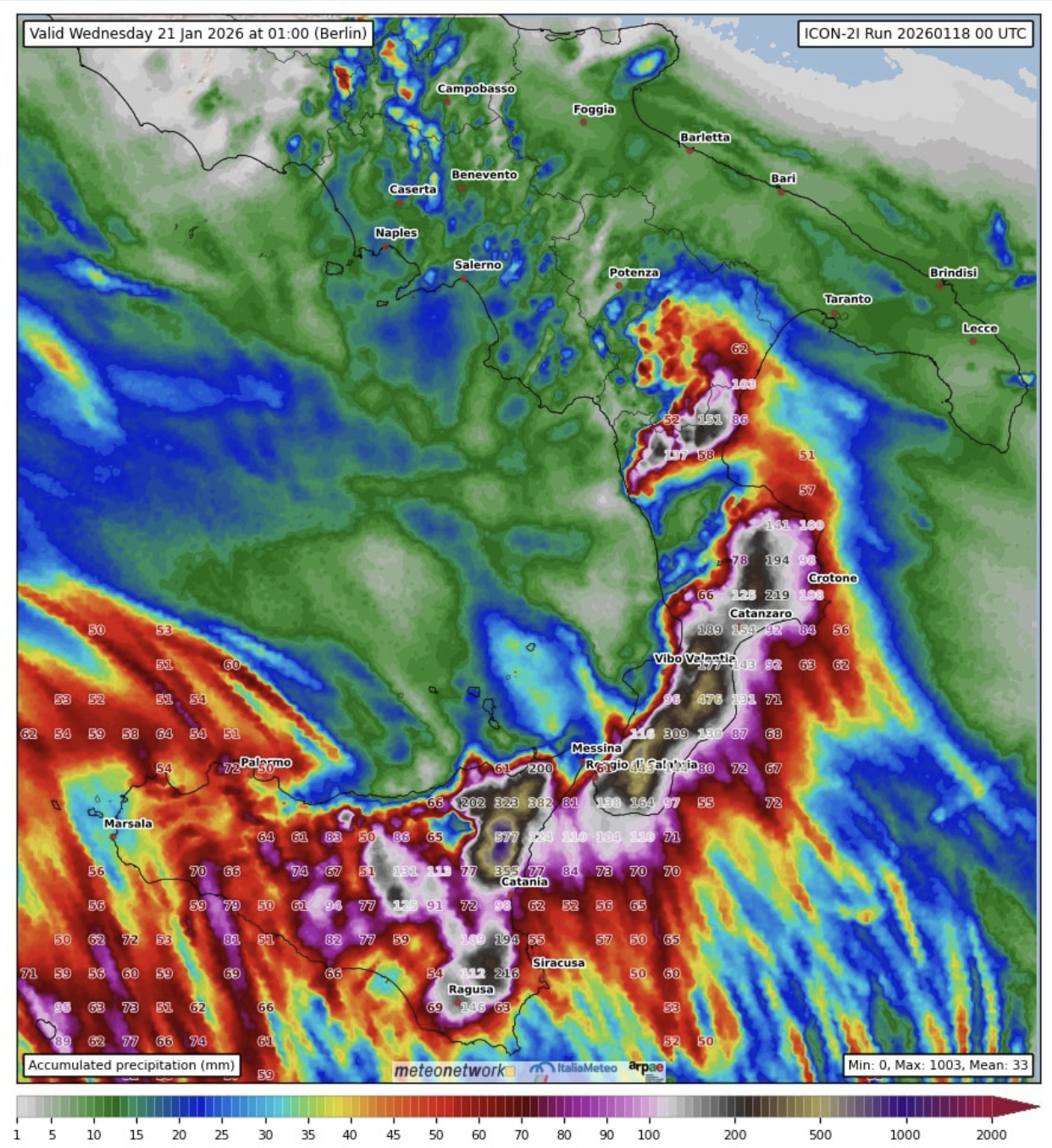 A 24-48 ore dall’evento, le mappe previsionali hanno cominciato a colorarsi sempre più, con le uscite modellistiche ad alta risoluzione… colori a fondoscala in alcuni casi: picchi diffusi di oltre 400-500 millimetri di pioggia in meno di 72 ore, con addirittura accumuli superiori sul comprensorio dell'Etna, dove a quote elevate erano previsti cumuli di neve al suolo di oltre 2-3 metri (fino a 5-7 metri sopra i 2500 m); raffiche di vento superiori a 200 km/h sul massiccio dell'Aspromonte, cime dell’Etna e Madonie; altezza massima delle onde anche superiore ai 8-9 metri – quindi mare grosso molto grosso – con periodo d’onda anche oltre 11-12 secondi, pertanto caratteristiche “quasi oceaniche”, responsabili di mareggiate violentissime lungo le coste esposte, e con un impatto rilevante su infrastrutture, porti e litorali [1].