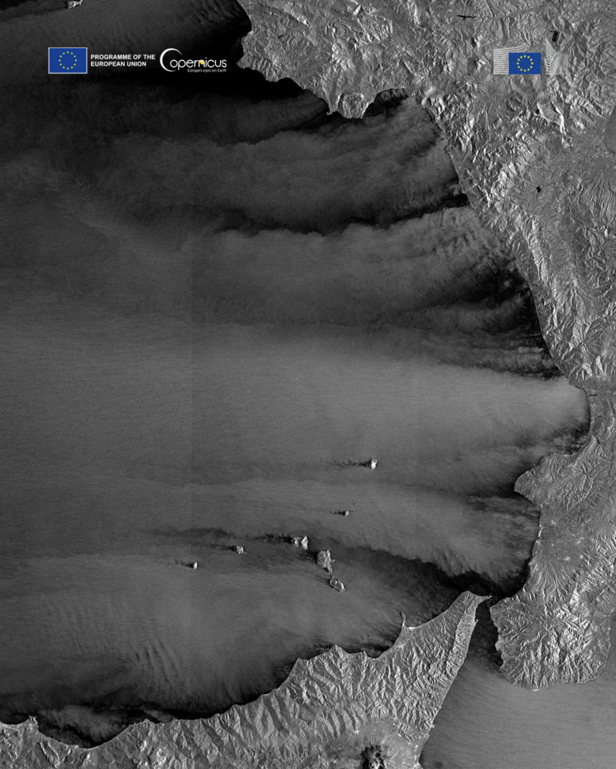 Intorno alle isole Eolie, le interazioni con il vento sono particolarmente dinamiche, interrompendo queste il flusso, generando schemi di scia, turbolenze e fecce protette, tutto chiaramente inciso sulla superficie del mare [29].