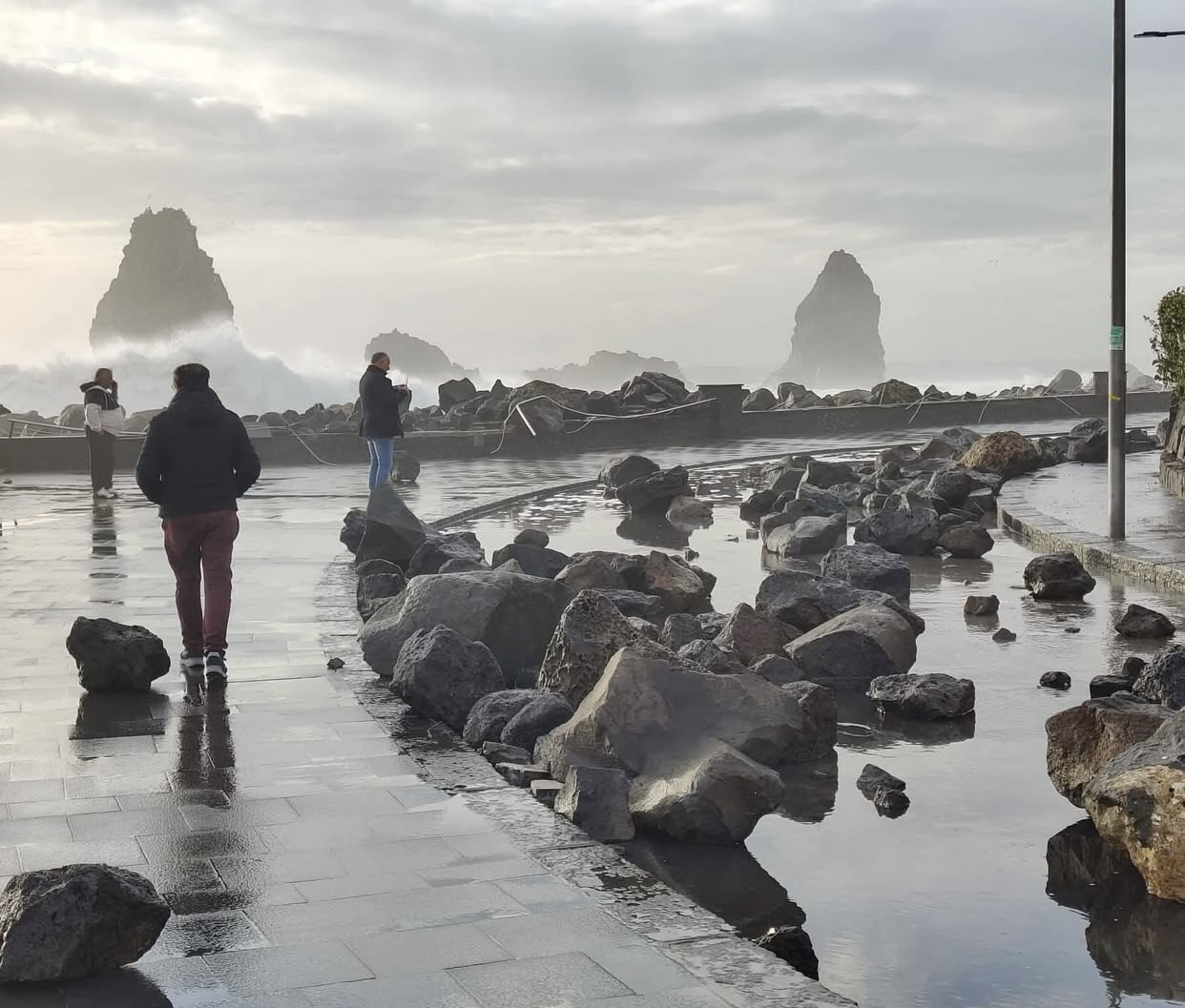 - Particolarmente colpita la zona dei borghi acesi: ad Acireale (CT), per via dell’allerta rossa, è stata ordinata l’evacuazione immediata in via precauzionale a Capo Mulini e Santa Maria La Scala, per mareggiate violente e rischio strutturale alle abitazioni; danni anche nella frazione di Stazzo e Pozzillo. Forte mareggiata ad Aci Trezza (CT), dove alcune imbarcazioni sono state trascinate fuori dall’acqua e le strade sono state invase da rocce e detriti (vedi Figura 4.9), e in generale ad Aci Castello (CT).