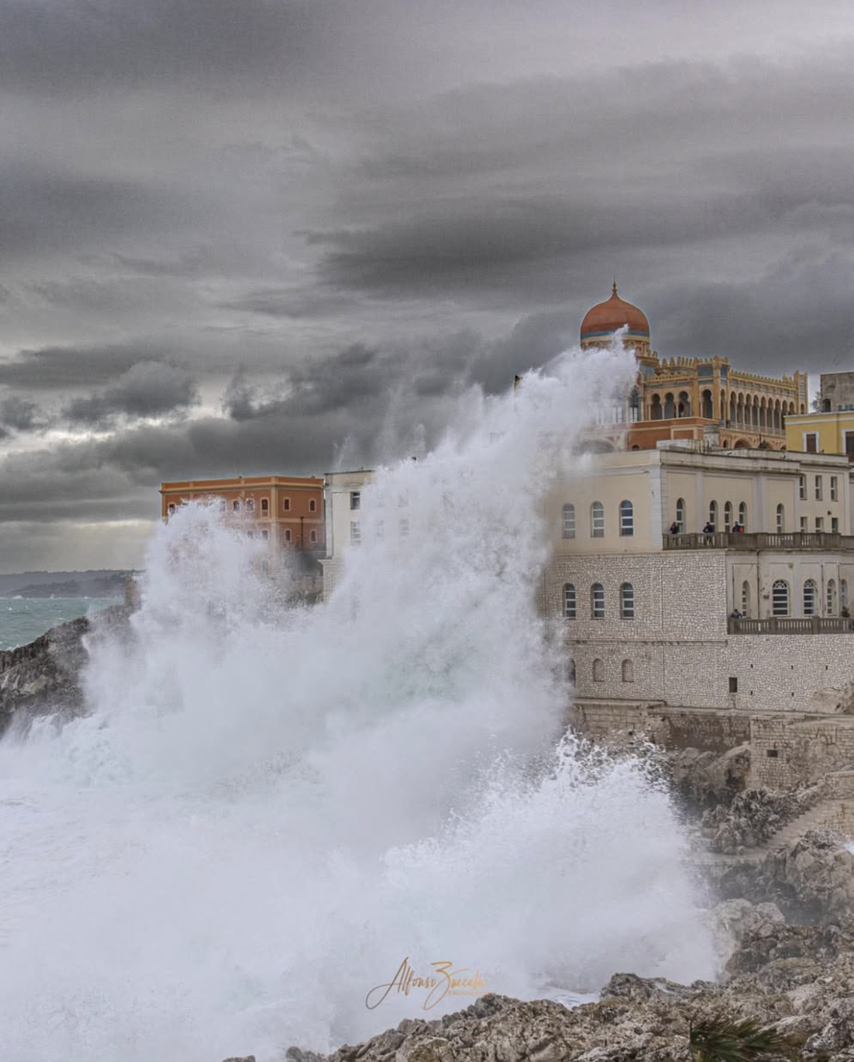 Non solo Calabria, Sicilia e Sardegna, anche la Puglia è stata interessata parzialmente dall’ondata di maltempo: a Santa Cesarea Terme (LE), località situata sulla costa sud-orientale della penisola salentina, un’onda gigante è stata immortalata dal fotografo Alfonso Zuccala (vedi Figura 12.11) nell’istante in cui raggiunge l’alta cupola di Villa Sticchi.