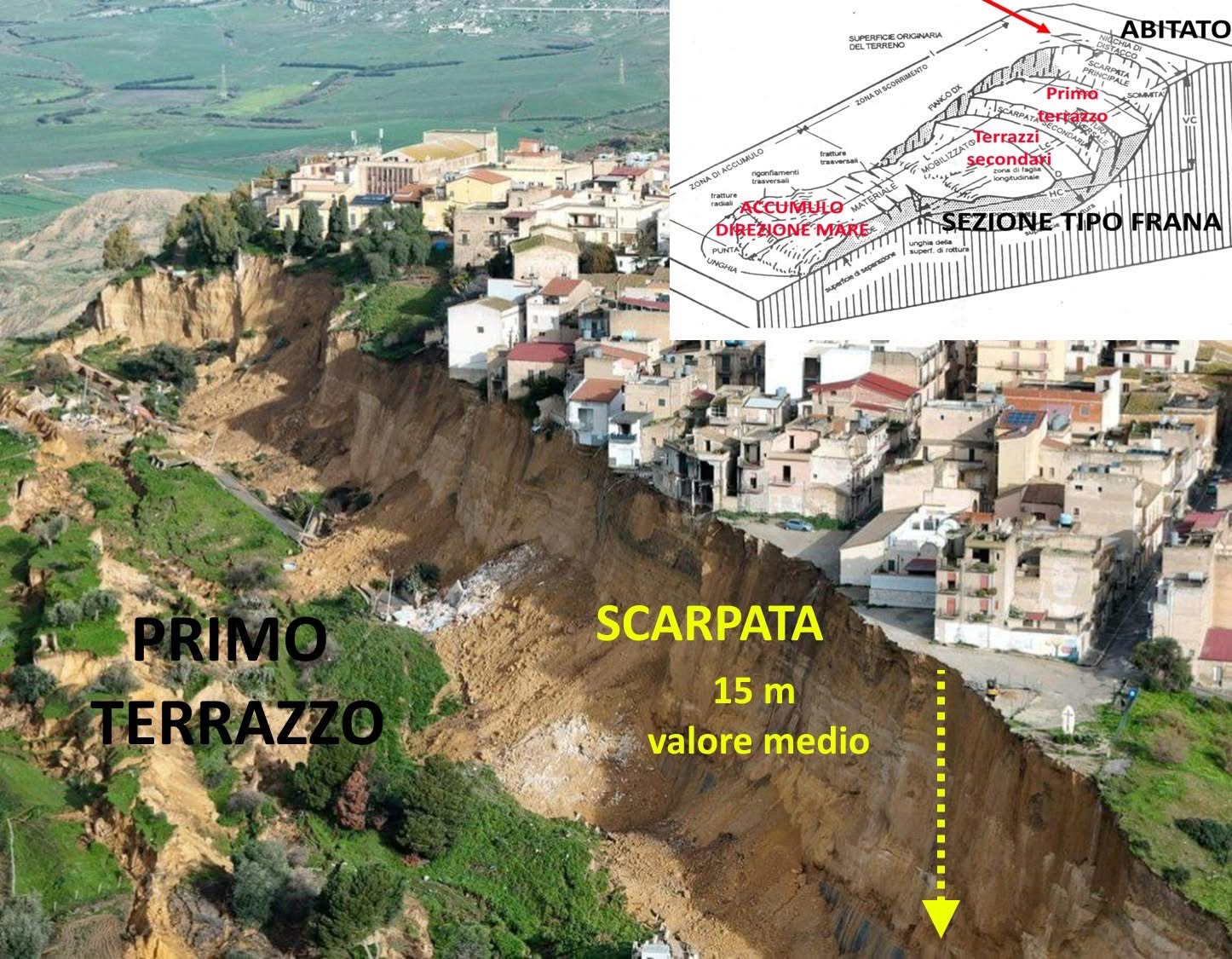 La frana è ancora in movimento e si stima che anche le case a 50-70 metri dal fronte possano cadere dalla scarpata prossimamente.