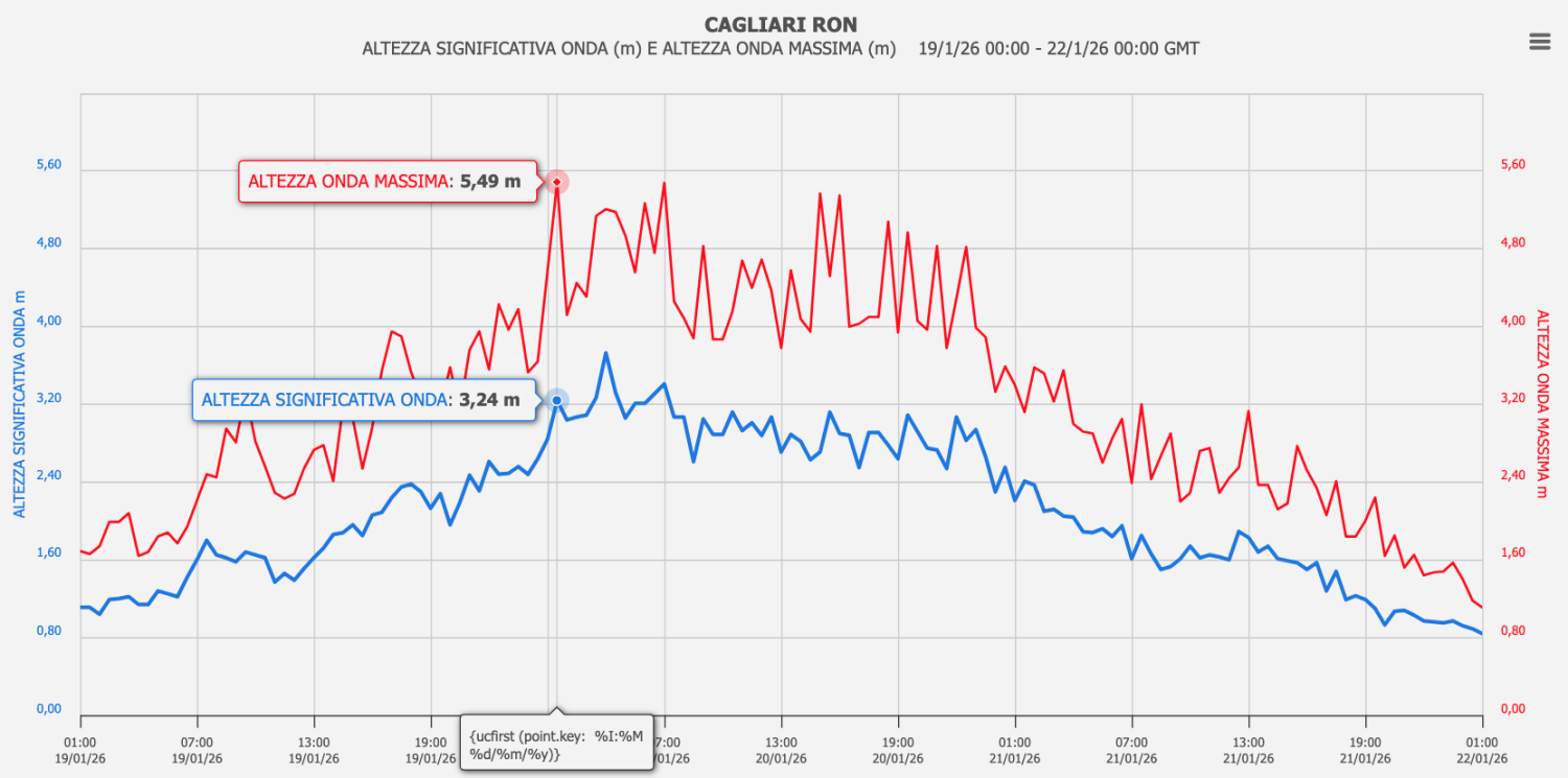 - Cagliari – al largo di Capo Boi: 5.49 m di altezza d’onda massima (ore 2:30 del 20/01) e onda significativa massima 3.73 m (ore 5:00 del 20/01); 12.19 s di periodo di picco registrato alle ore 16:00 del 20/01 e alle ore 23:30 del 20/01.