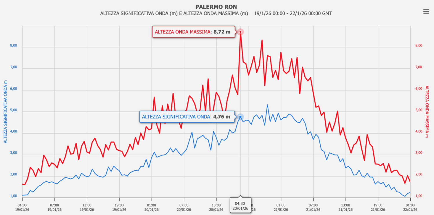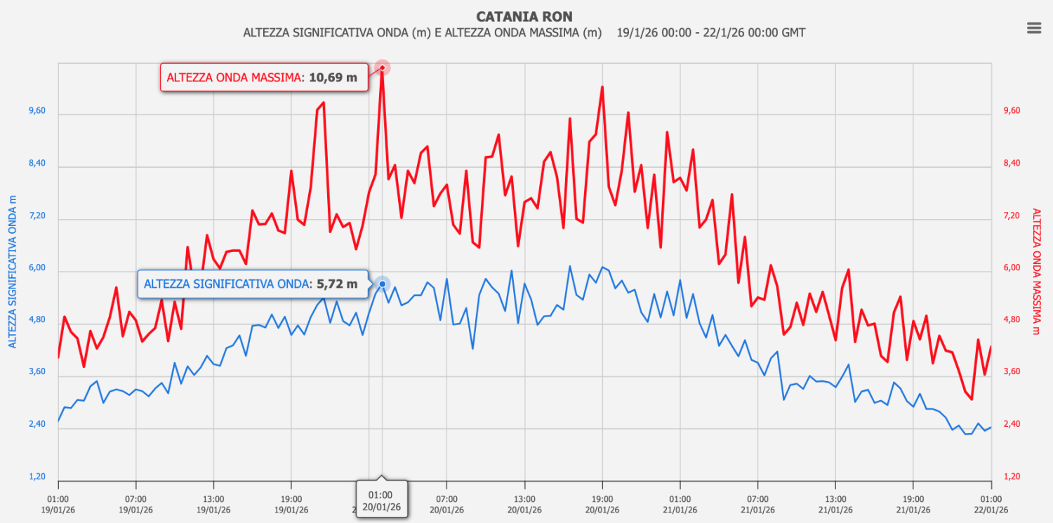 C’è infine un ultimo valore, il più significativo, dalla Rete Ondametrica e Correntometrica di altura di ISPR: la boa di Portopalo, al largo della costa siracusana tra Portopalo di Capo Passero e Malta, che alle ore 15:30 del 20/01 ha registrato un valore eccezionale di 16.66 m di altezza d’onda massima e alle ore 18:30 del 20/01 ha invece rilevato 8.88 m di onda significativa massima!