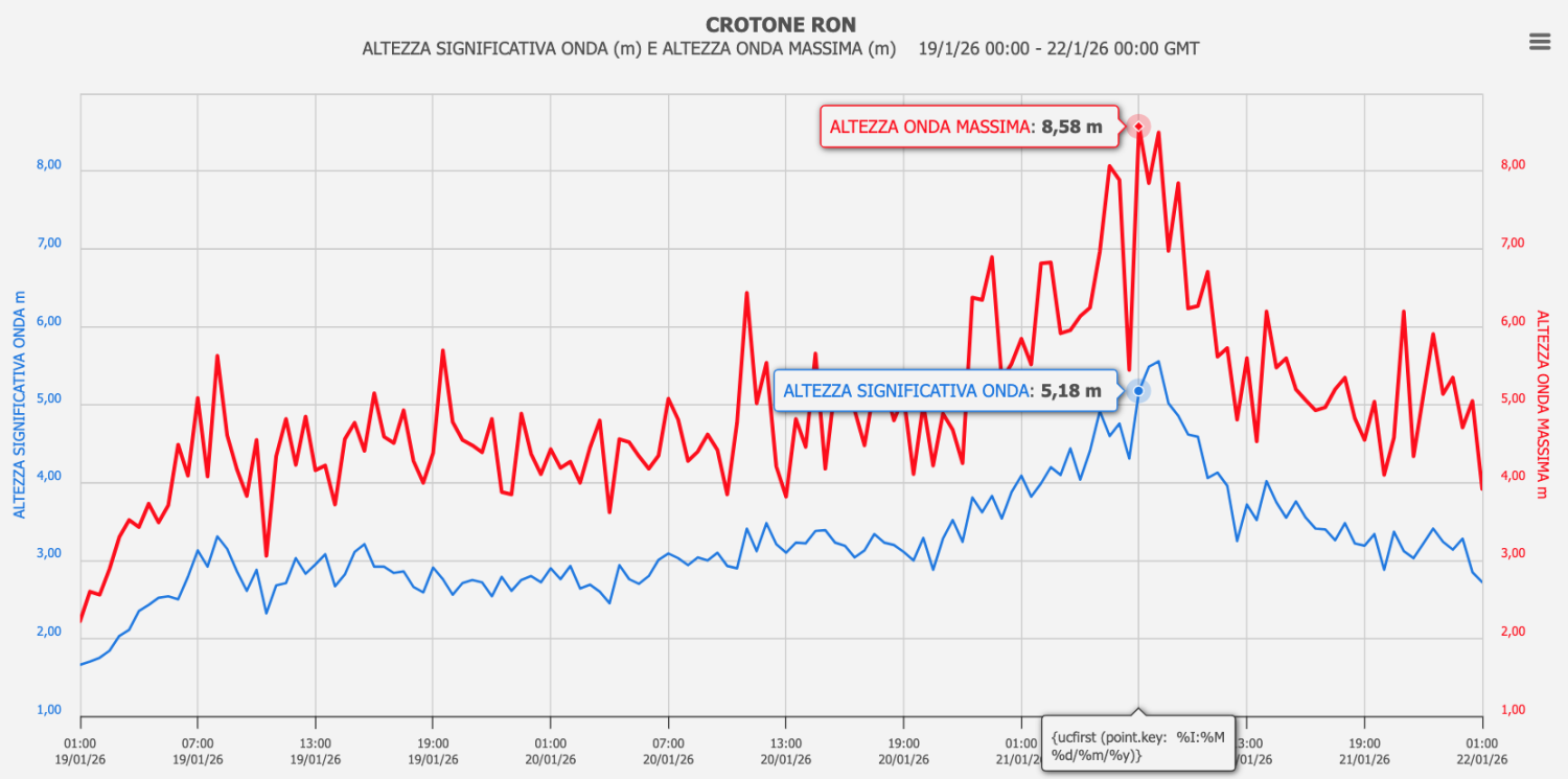 - Crotone – al largo di Capo Colonna: 8.58 m di altezza d’onda massima (ore 8:00 del 21/01) e onda significativa massima 5.56 m (ore 9:00 del 21/01); 11.64 s di periodo di picco registrato più volte dalle ore 21:00 del 20/01 alle ore 1:00 del 22/01, forse un altro valore soglia per questa stazione.