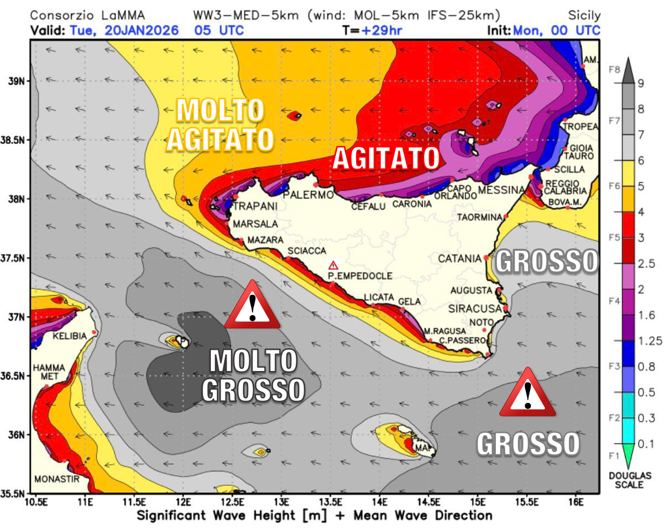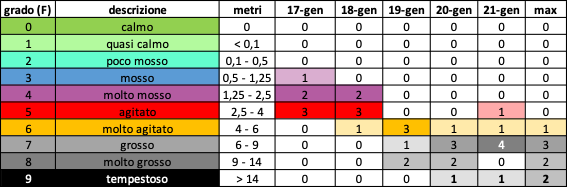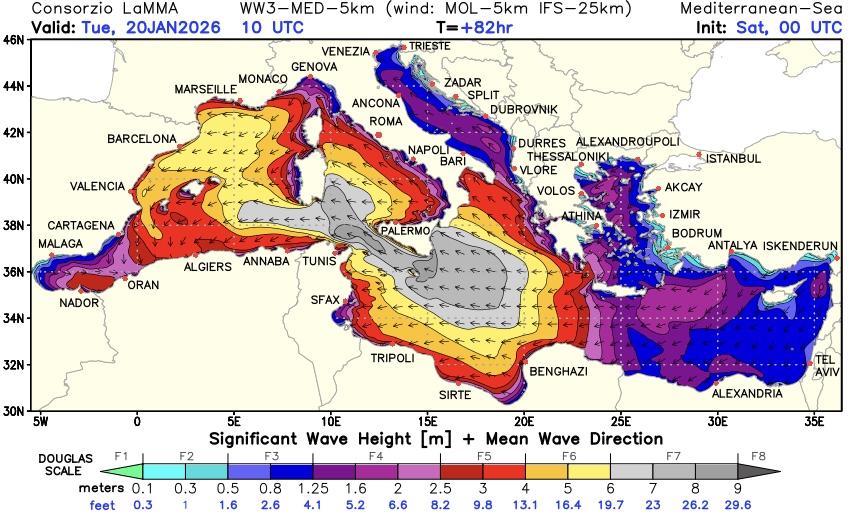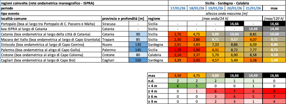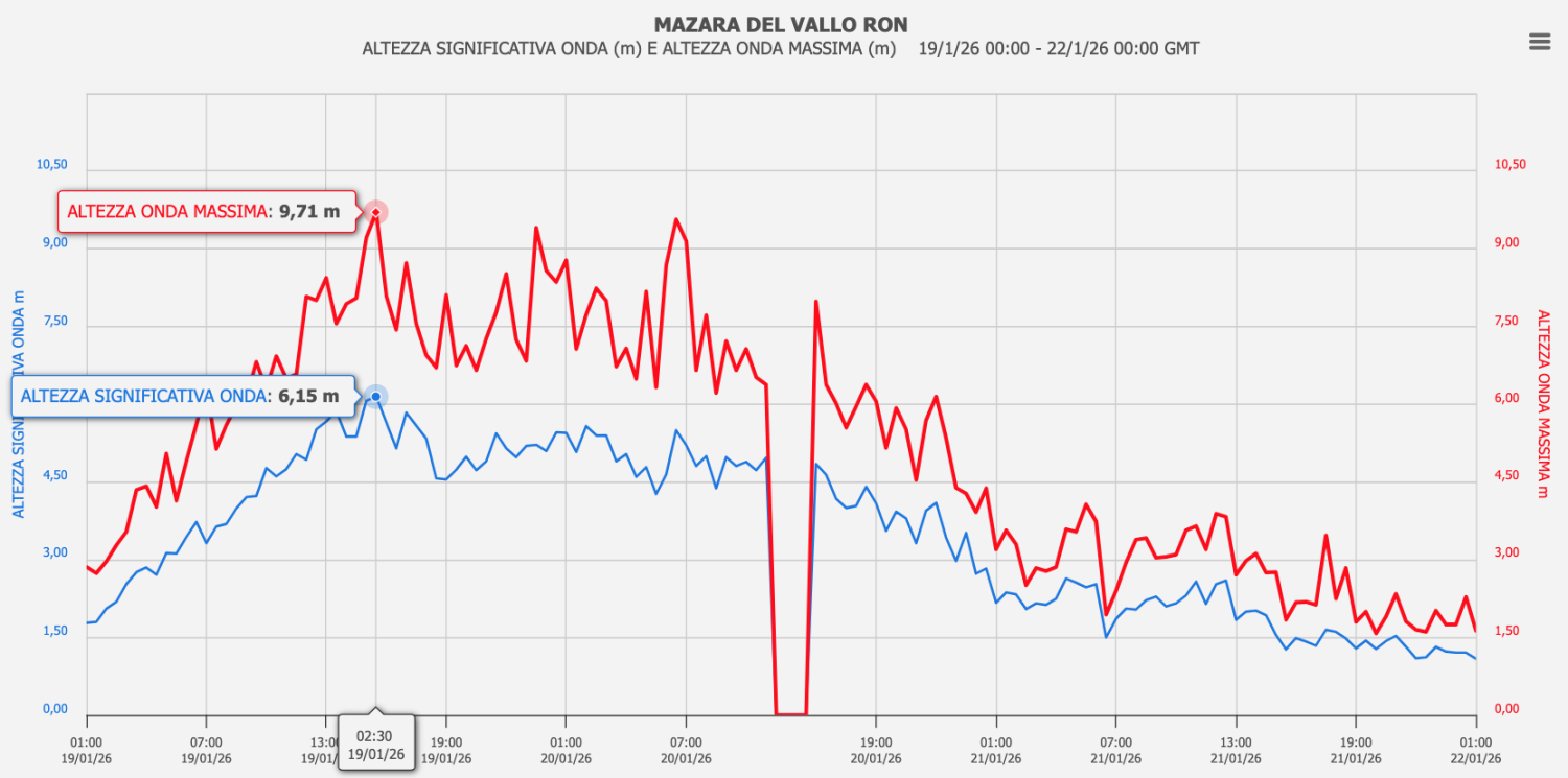 - Mazara del Vallo (TP) – al largo di Capo Granitola: 9.71 m di altezza d’onda massima e onda significativa massima 6.15 m, entrambe registrate alle ore 16:30 del 19/01; 14.22 s di periodo di picco registrato più volte a partire dalle ore 21:30 del 20/01 e alle ore 7:30 del 21/10, forse un valore soglia oltre il quale lo strumento non misura, il che renderebbe il periodo d’onda massimo ancora più incredibile.