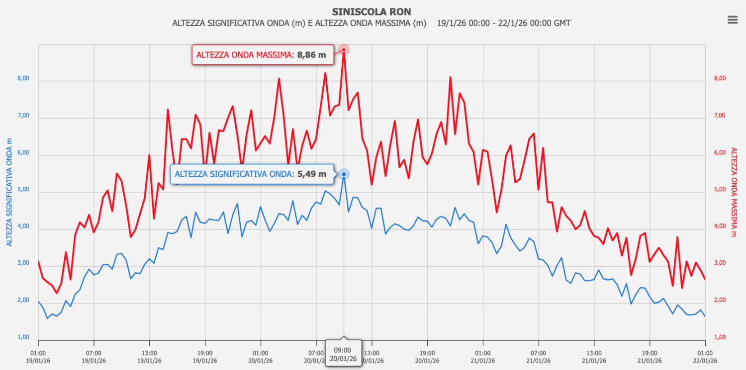 - Siniscola (NU) – al largo di Capo Comino: 8.86 m di altezza d’onda massima e onda significativa massima 5.49 m, entrambe registrate alle ore 11:00 del 20/01; 11.13 s di periodo di picco registrato più volte dalle ore 23:00 del 19/01 alle ore 4:00 del 21/0.