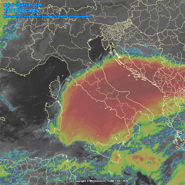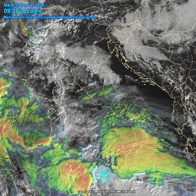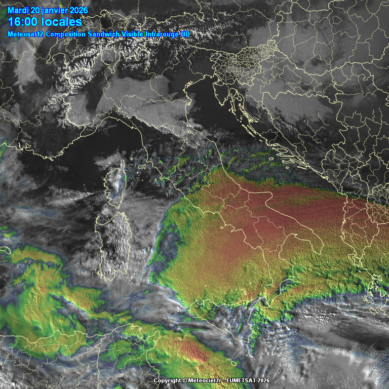 Figura 2.1-4: Immagini satellitari di Meteosat12, (1-2) del tipo sandwich visible/infrarossi HD dell’Italia, fonte: Meteociel.fr.