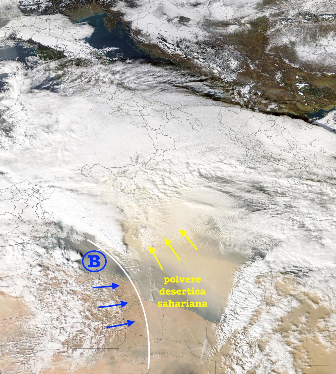 Come visibile in Figura 3.1, il Centro-Sud è stato coperto nella giornata di martedì 20 da un’ampia distesa nuvolosa sterile di centinaia di chilometri, dovuta alla presenza di altostrati formatisi in un contesto di risalita di polvere sahariana (vedi Figura 3.3), che hanno favorito la condensazione e di conseguenza la formazione di nuvole a quote medie.